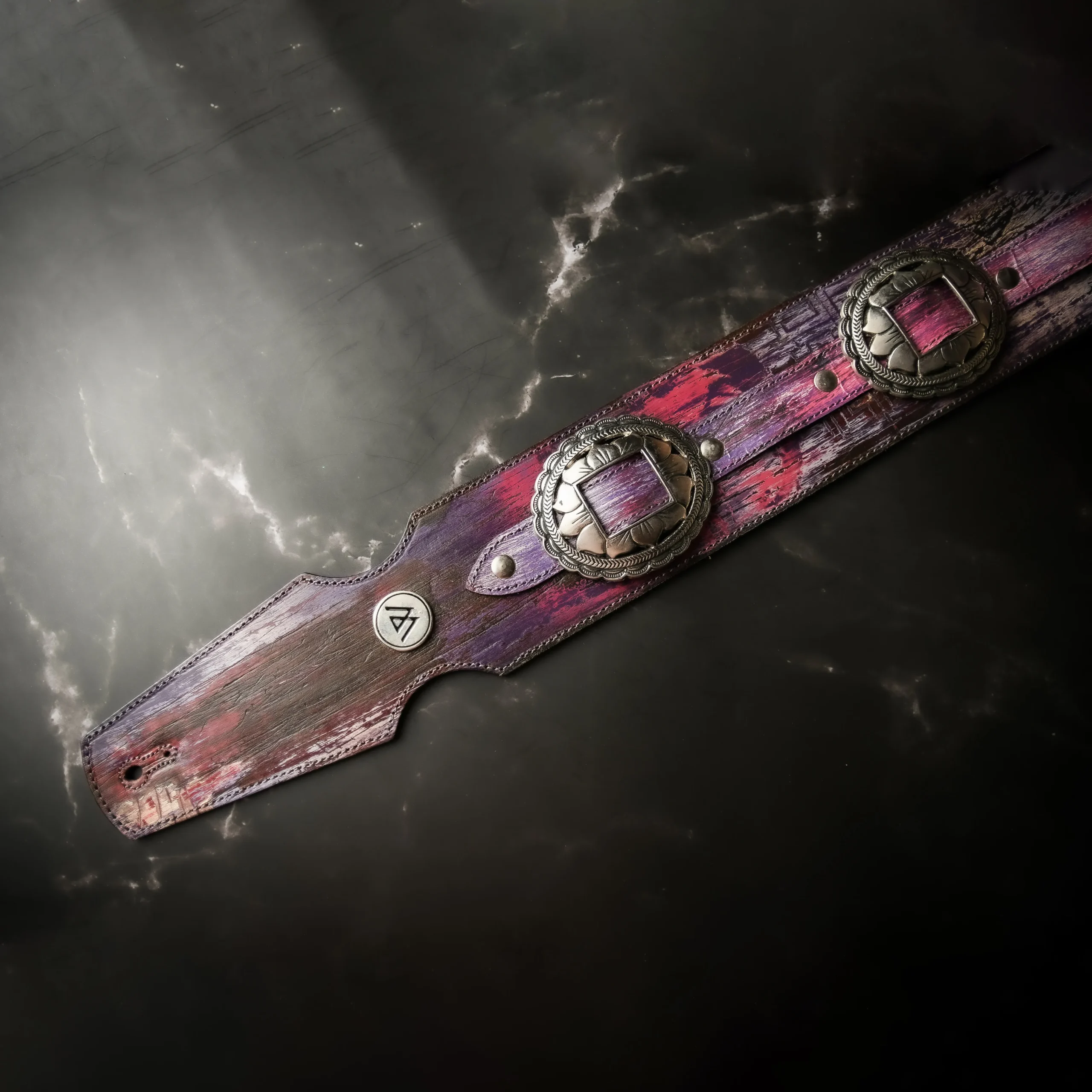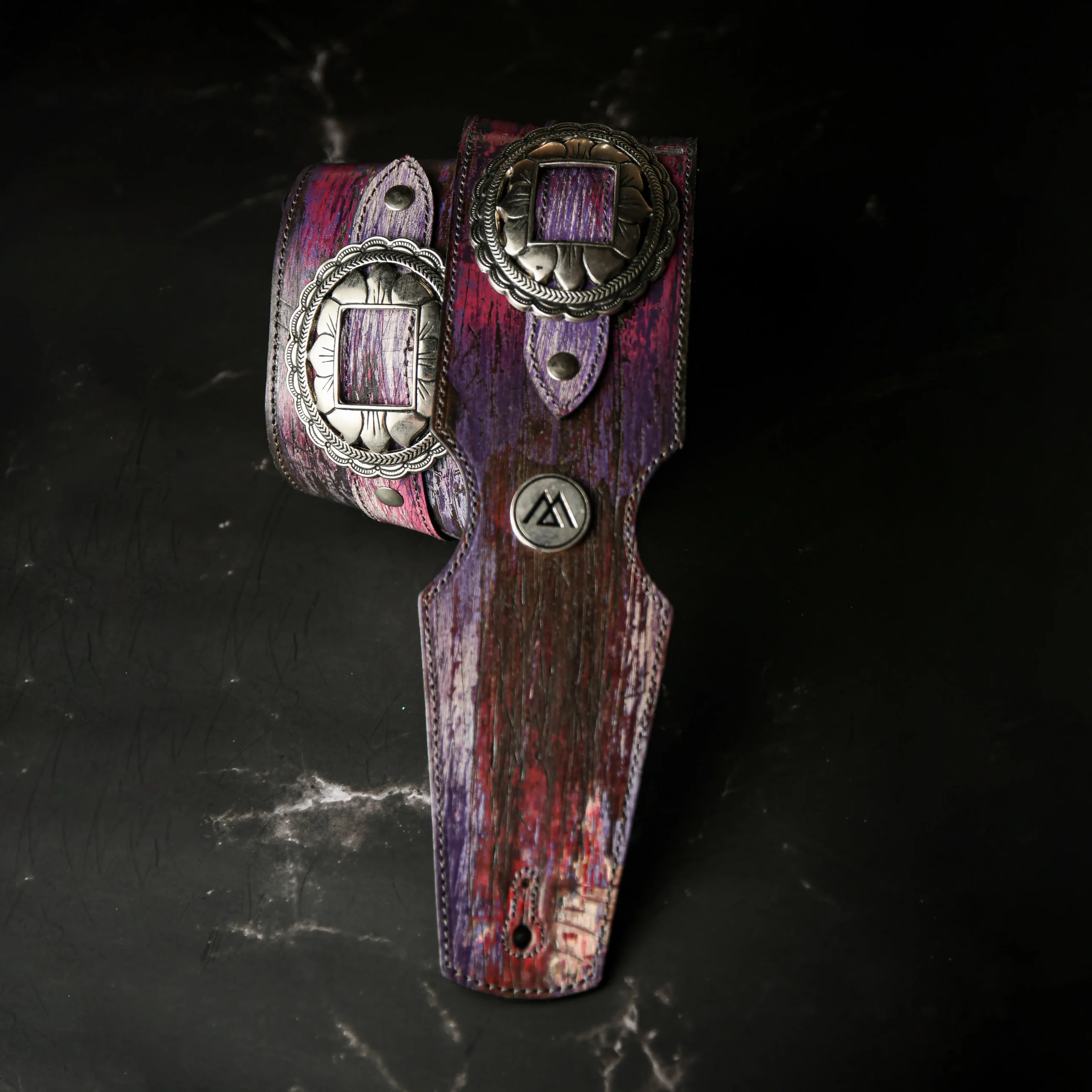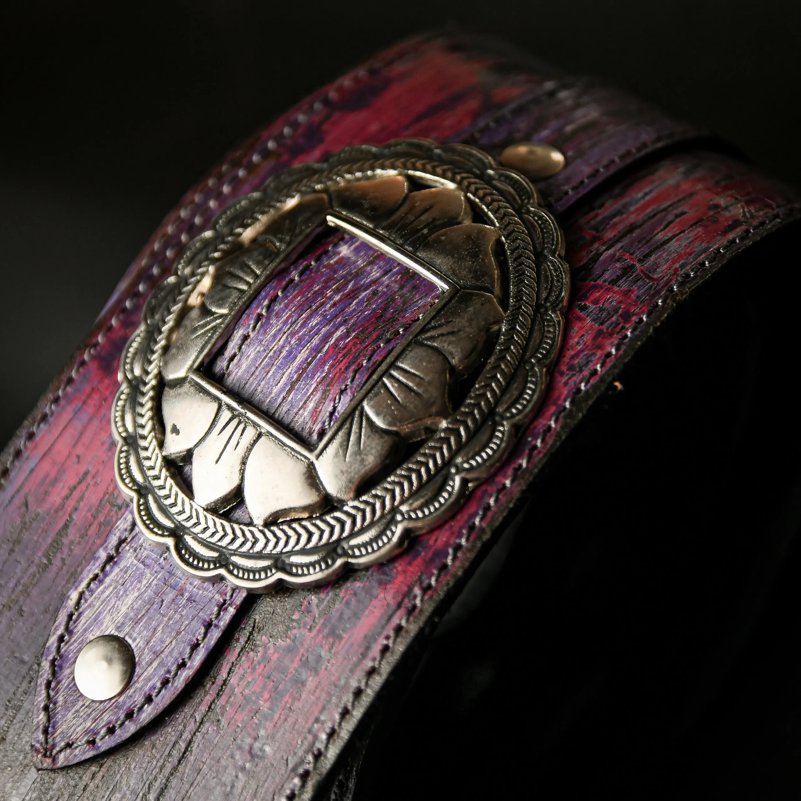 Esta pieza única nace de un proceso artesanal superior, logrando texturas irrepetibles en tonos púrpuras y destellos de fuego para una presencia escénica absoluta. Confeccionada con doble capa de cuero genuino en 8 cm de ancho para máximo confort y realzada por imponentes apliques metálicos con relieves artísticos.