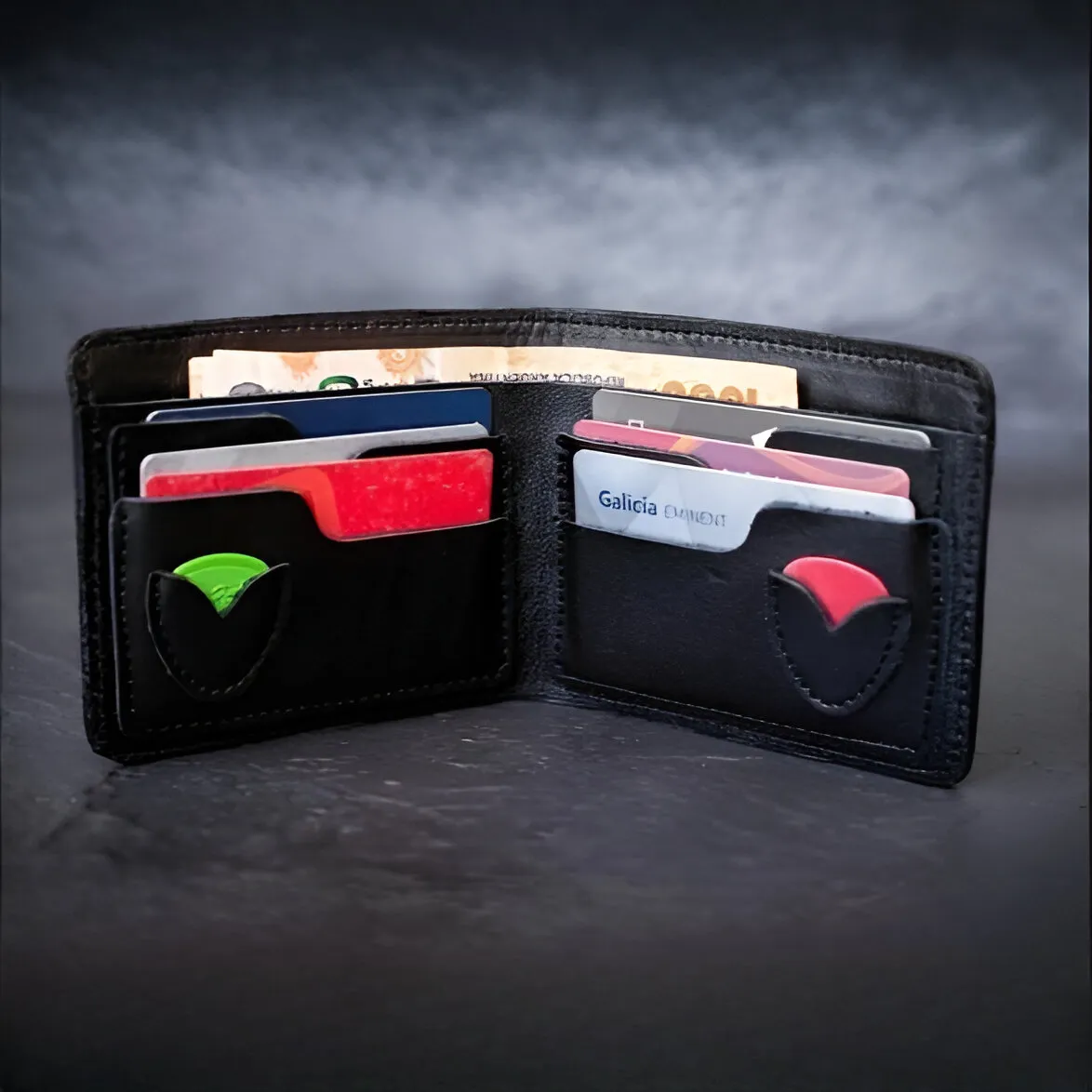 Cuenta con espacio para 6 tarjetas, 2 púas, efectivo, y un orificio especial para colocar una cadena o colgante. Su tamaño ha sido cuidadosamente diseñado para adaptarse cómodamente a billetes argentinos y extranjeros.
