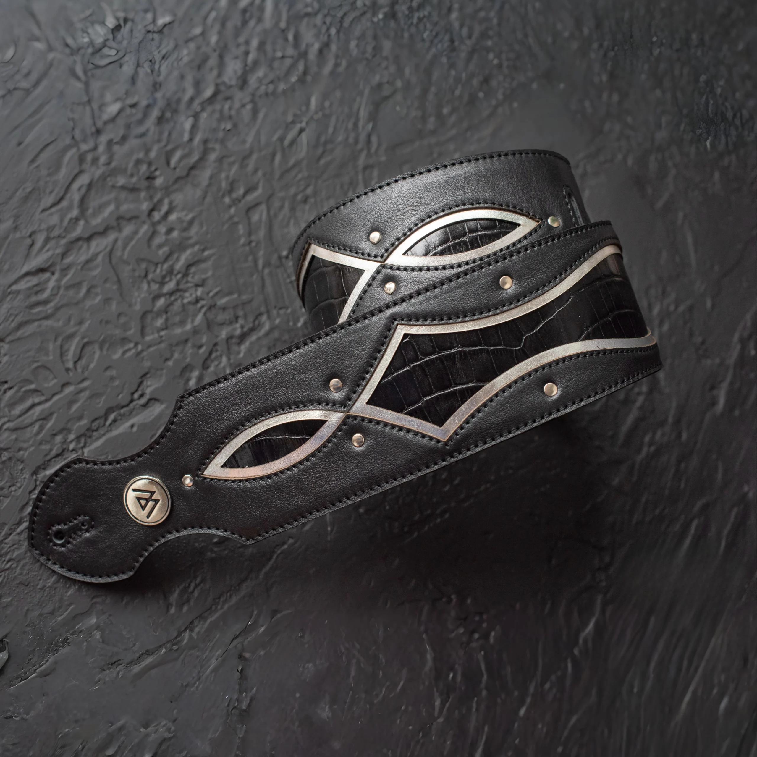 Infinity Crocco es una correa de cuero de 8 cm, imponente y artesanal. Combina negro y un estampado reptil con textura escamada y detalles metálicos dorados o plateados a elección envejecidos, generando un diseño robusto, único y lleno de carácter para guitarra o bajo.