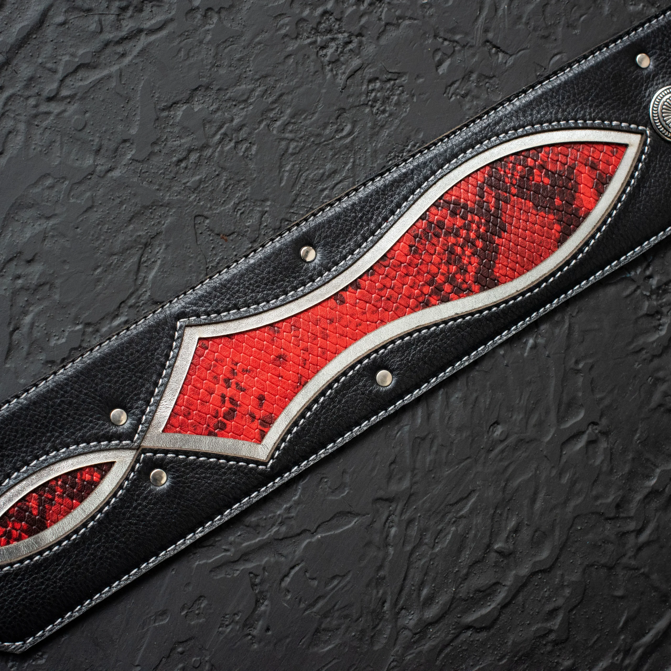 Infinity Micrurus es una correa de cuero de 8 cm, imponente y artesanal. Combina negro y un estampado de vibora en rojo con detalles metálicos plateados envejecidos, generando un diseño robusto, único y lleno de carácter para guitarra o bajo.