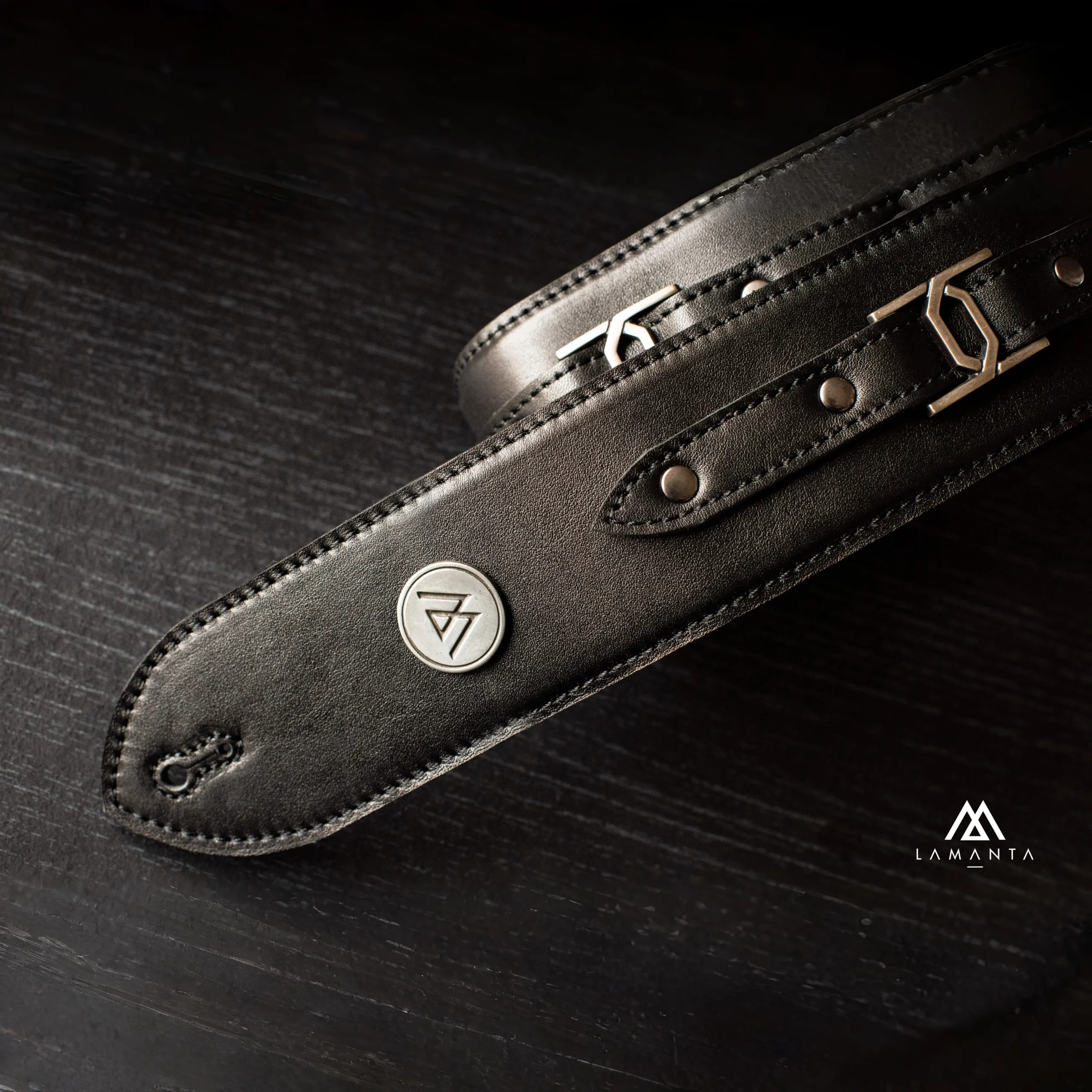 Diseñada junto a Midori Tatematsu (Lovebites), esta correa está hecha en cuero vacuno doble capa, disponible en 4 o 6 cm. Regulable de 1,10 a 1,45 m. En negro, marrón o blanco, con herrajes en plata, bronce o edición limitada en oro.