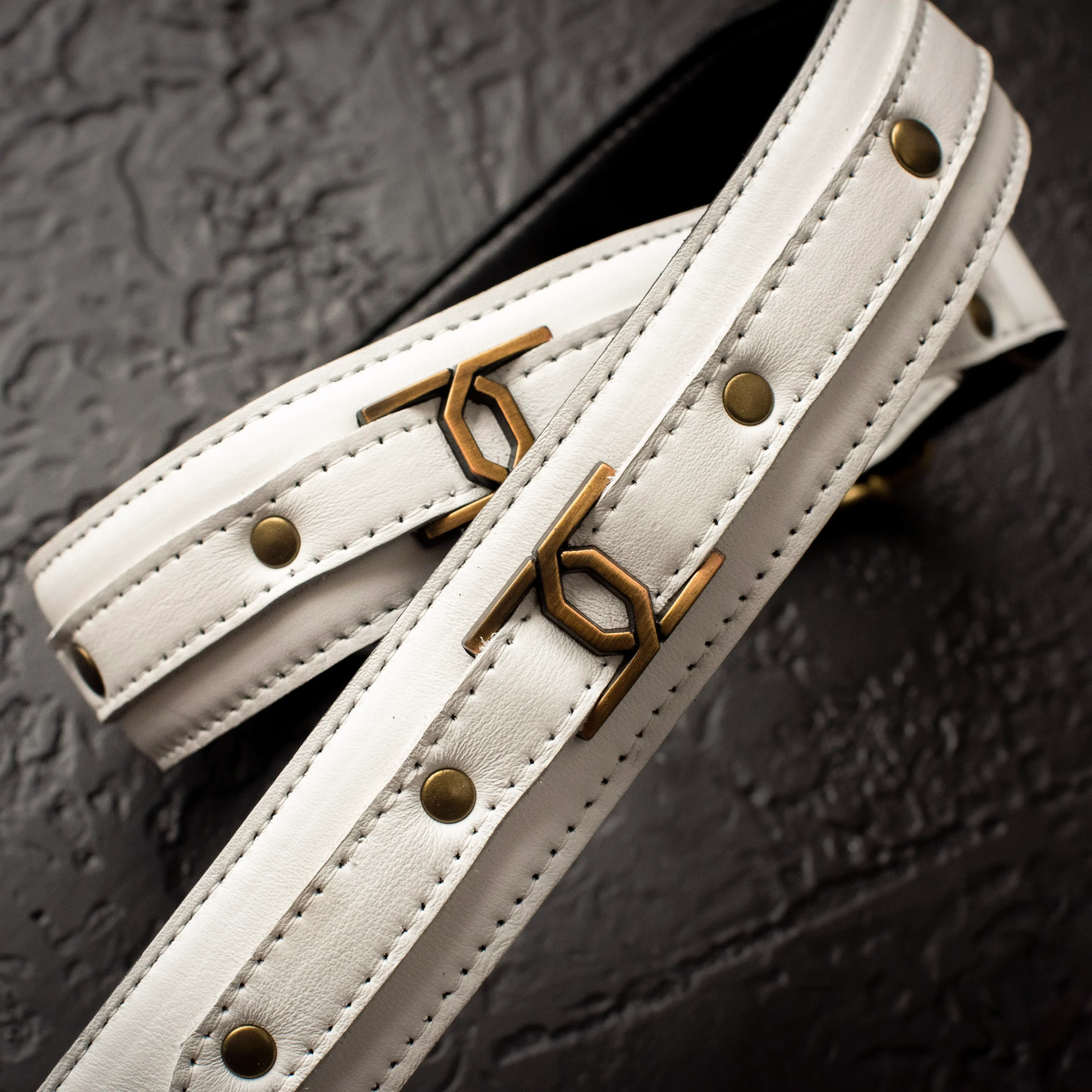 Modelo Midori White: correa de 4 cm en cuero blanco con doble capa. Herrajes metálicos simil oro. Regulable de 1,10 a 1,45 m. Elegancia, presencia y solidez en una pieza pensada junto a Midori Tatematsu.