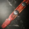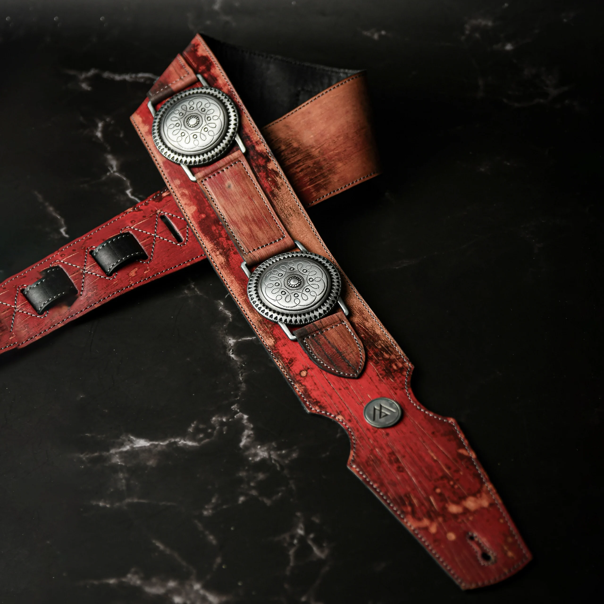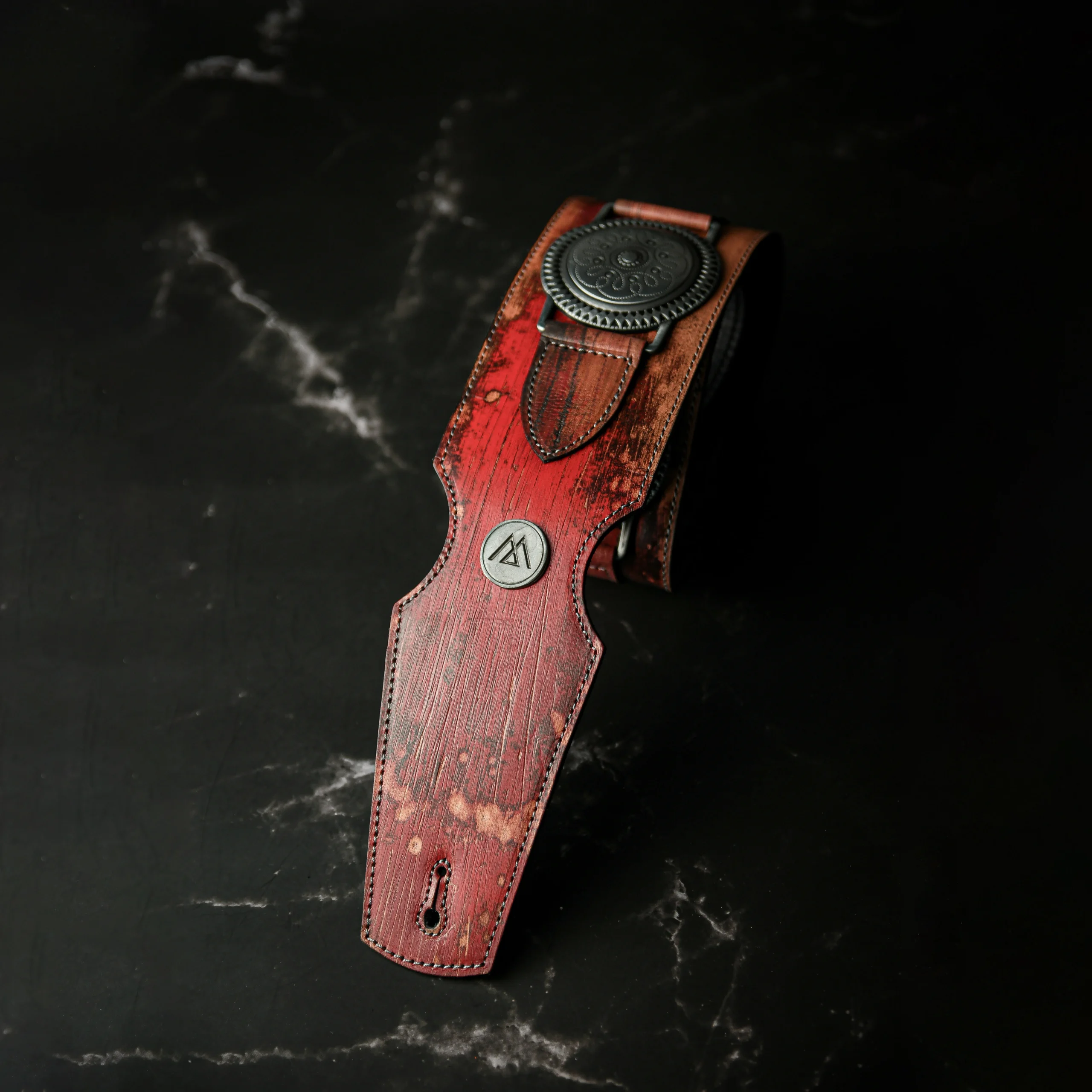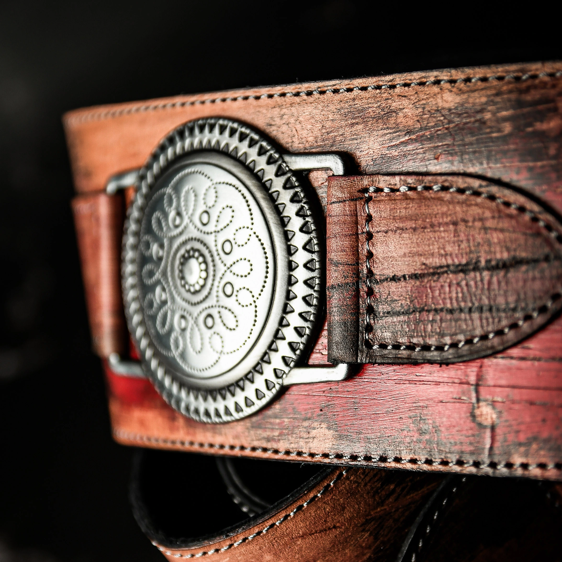 Esta pieza única nace de un proceso artesanal superior, logrando texturas irrepetibles en tonos rojizos para una presencia escénica absoluta. Confeccionada con doble capa de cuero genuino en 8 cm de ancho para máximo confort y realzada por imponentes apliques macizos bañados en plata.
