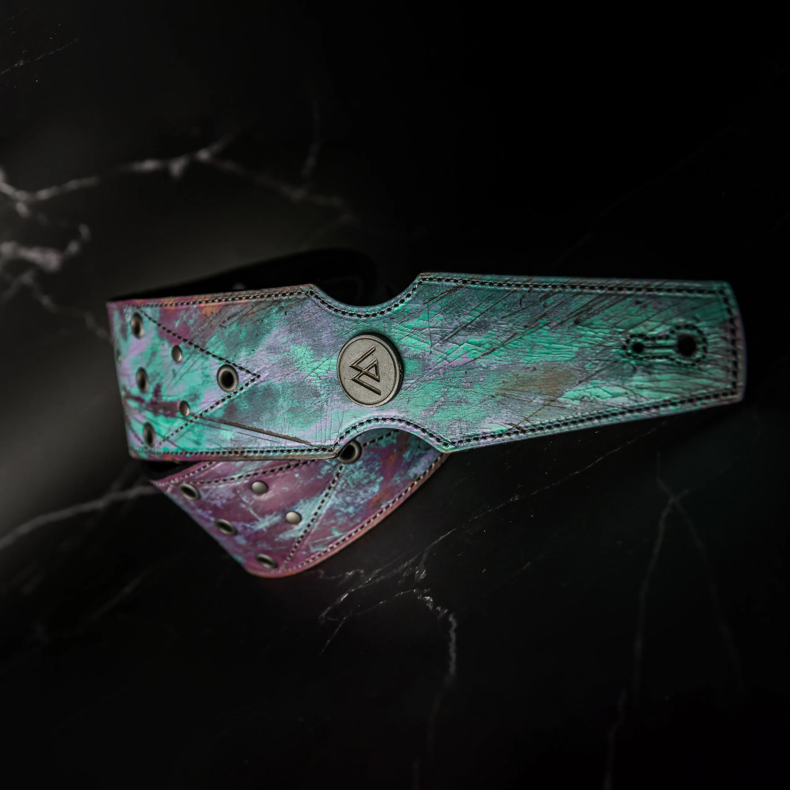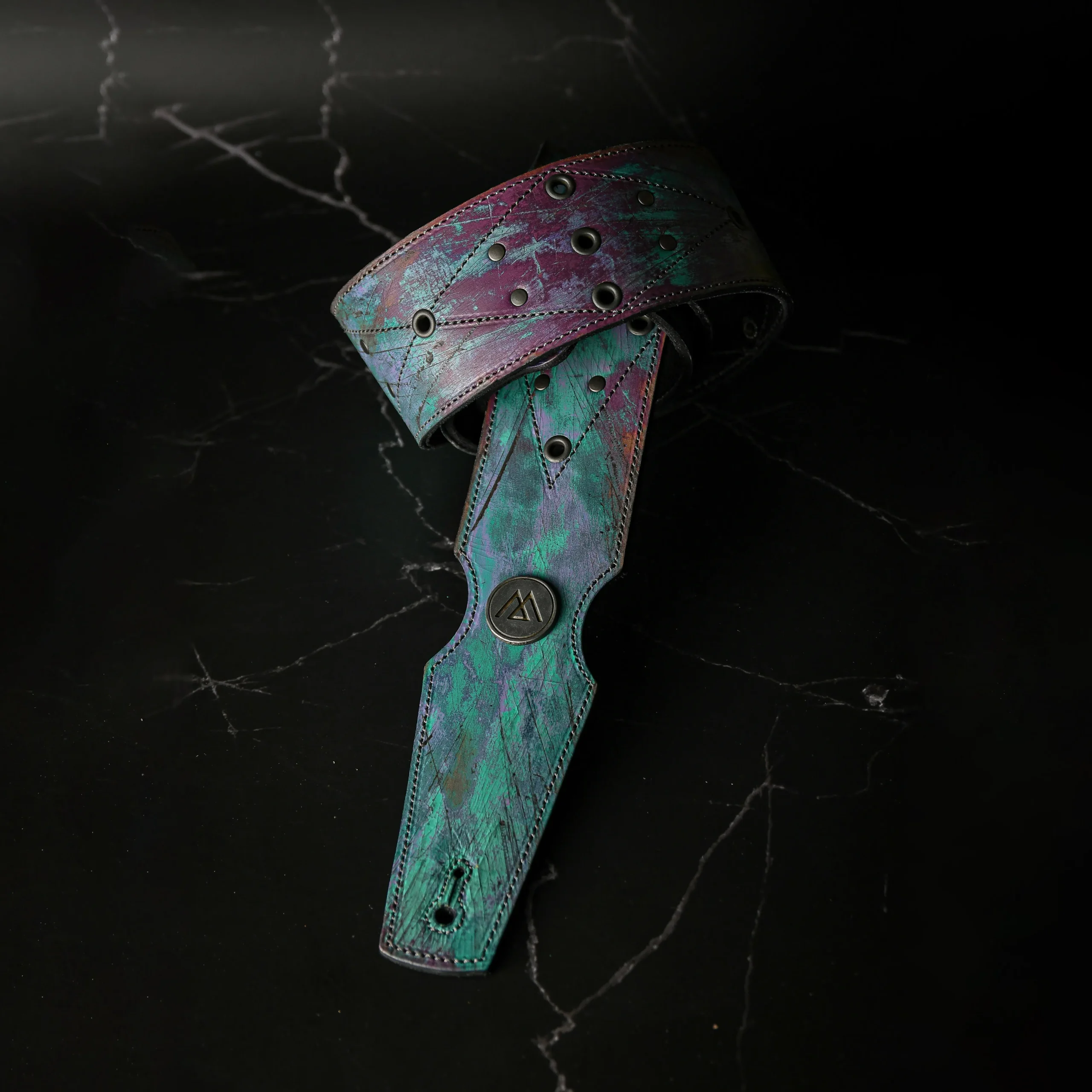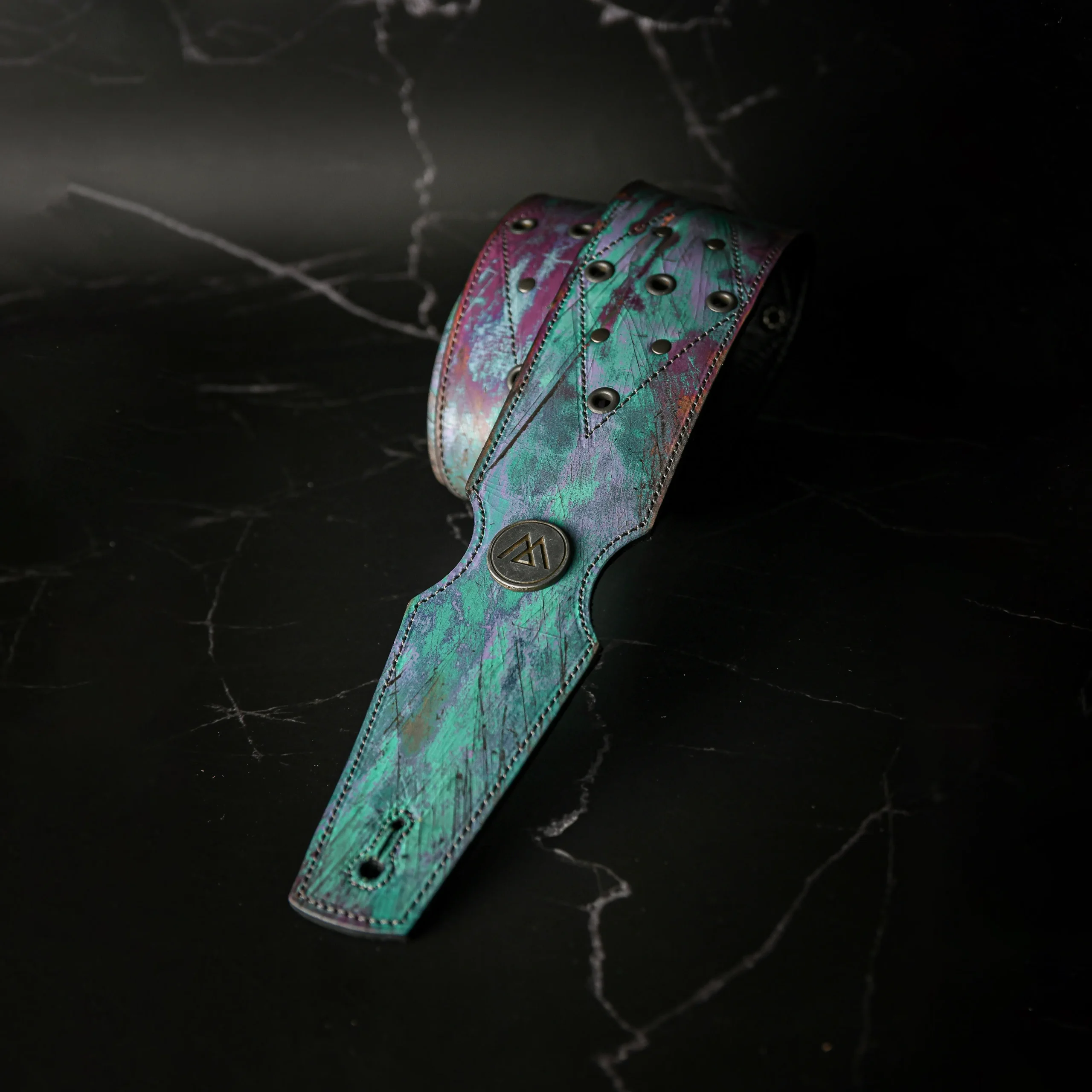 Esta pieza única nace de un proceso artesanal superior y complejo, logrando texturas irrepetibles en variedad de colores generando un estilo psicodélico y metales desgastados. Confeccionada con doble capa de cuero genuino para máxima solidez e intervenida con ojales y remaches de plata.