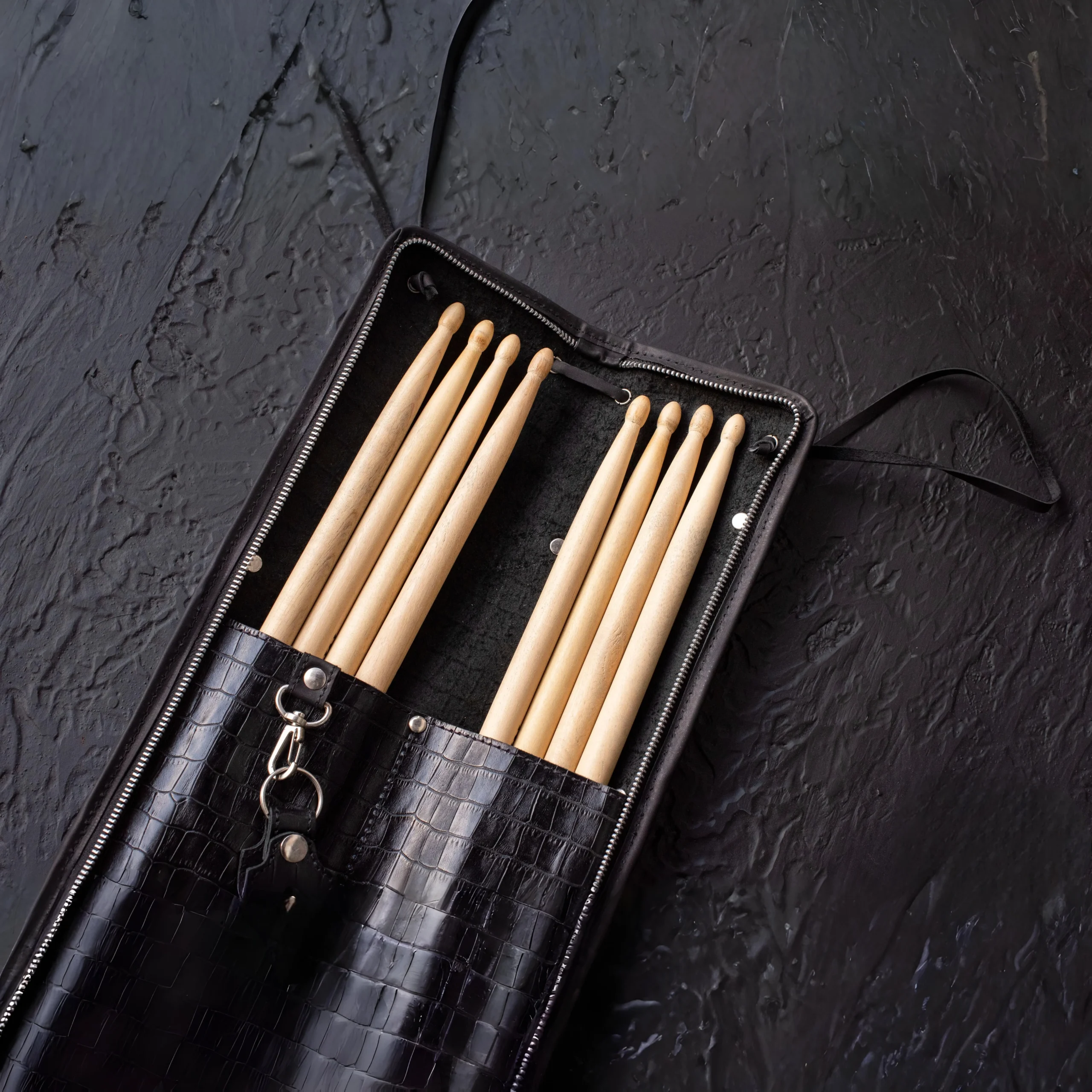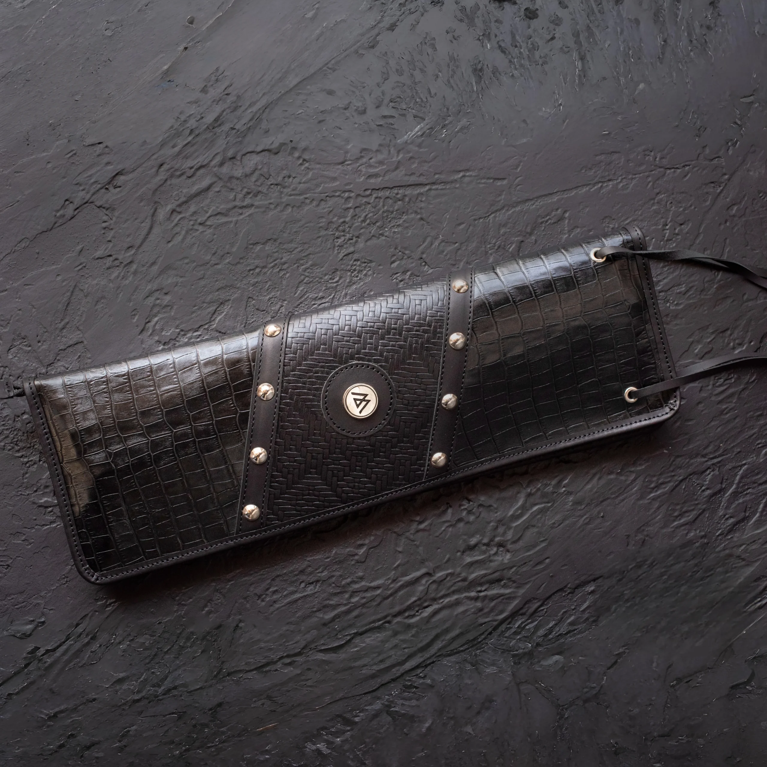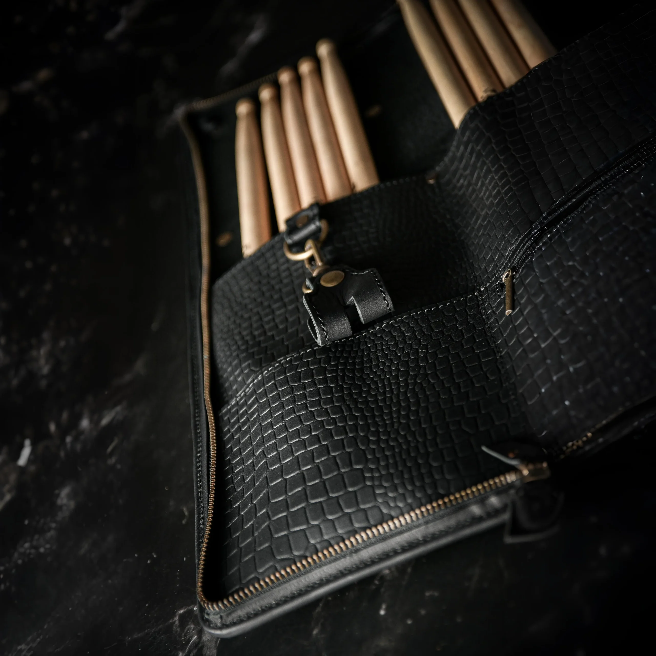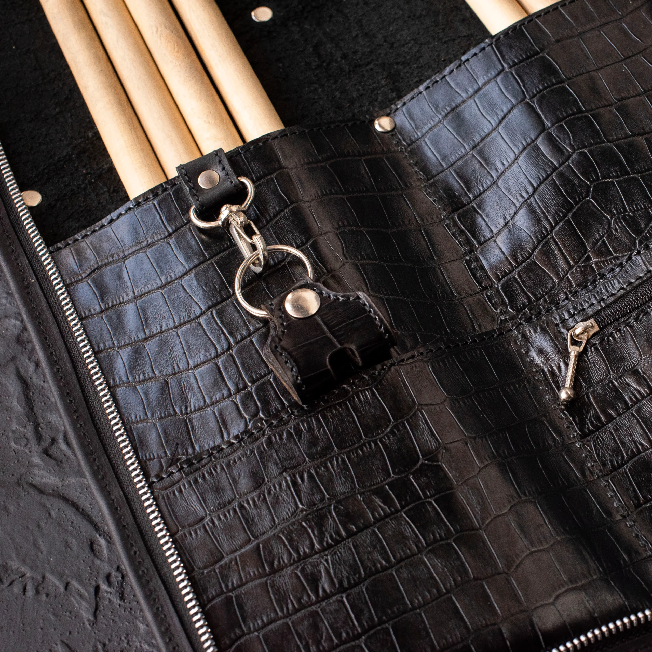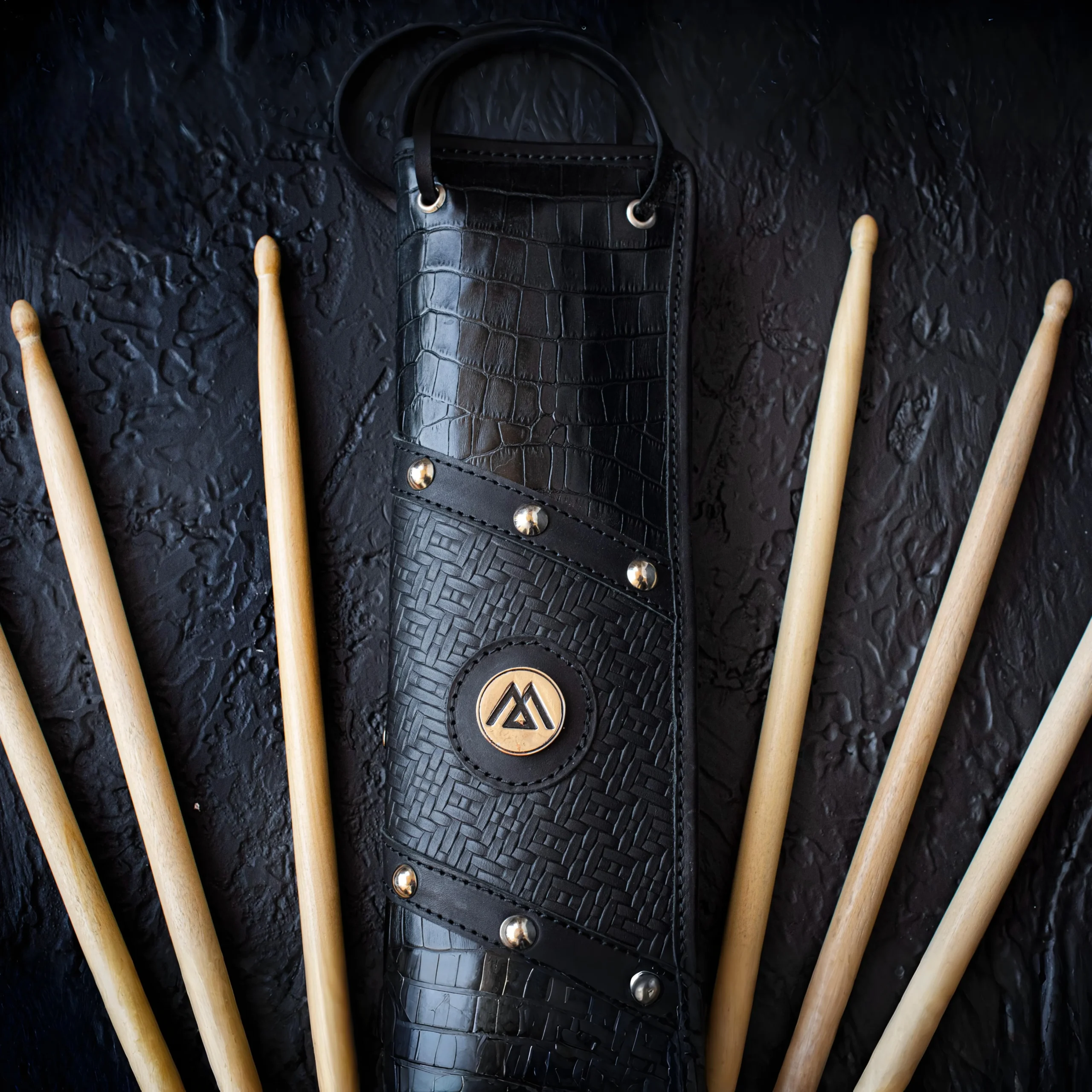 Portapalos Tyr de cuero real, ultra resistente. Disponible en dos tamaños: Little (4 pares) y Mid (8 pares). Con cierre metálico, porta afinador, bolsillo interno para celular y diseño de inspiración vikinga.