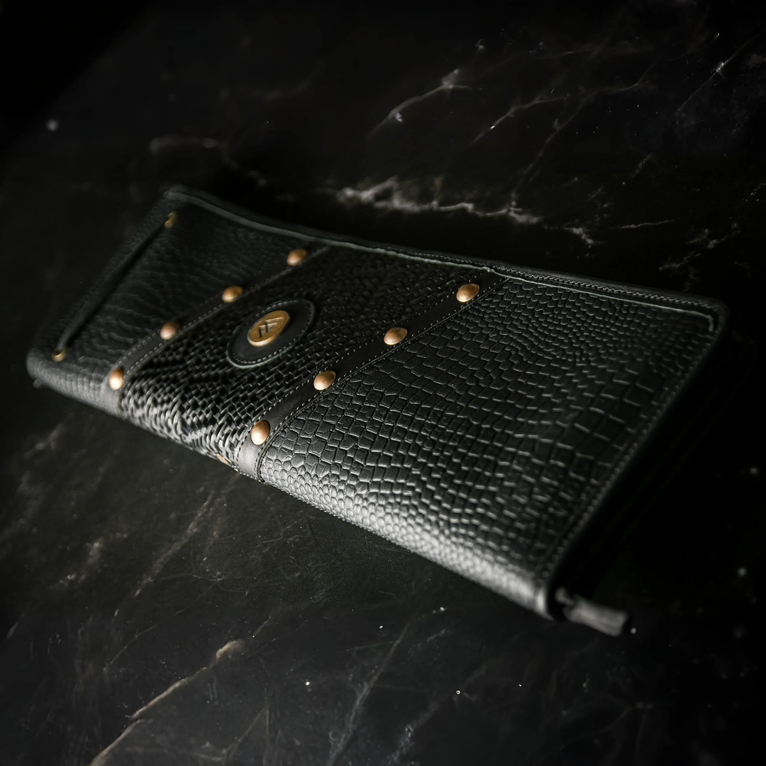 Cuenta con cierres metálicos, bolsillo interno con cierre para celular u objetos personales y porta afinador incluido, todo integrado con criterio funcional. Su construcción combina grabados en cuero y tachas, con una estética potente inspirada en el espíritu de los guerreros nórdicos.