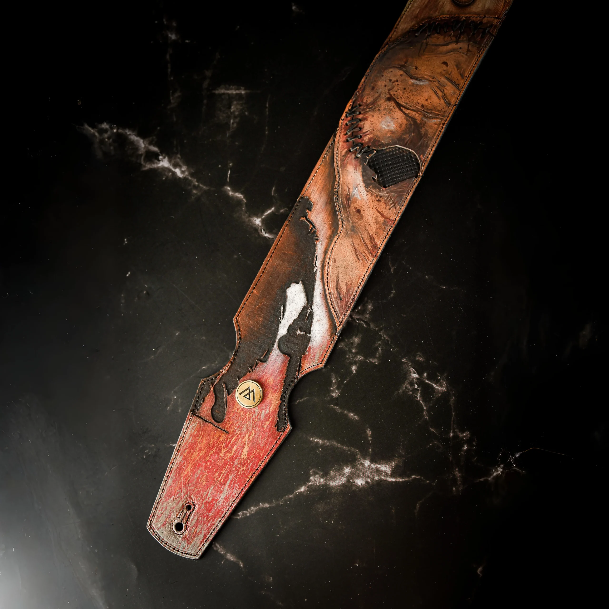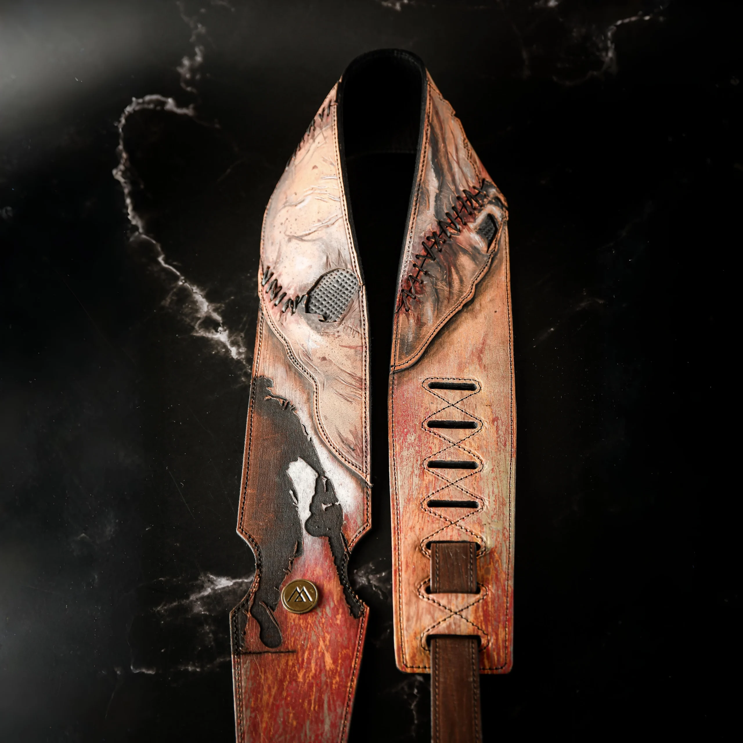 Limited edition guitar strap inspired by The Texas Chainsaw Massacre. Handcrafted leather, hyper-realistic details by a professional SFX artist, and a custom relic finish bring classic horror to life in a brutal, one-of-a-kind piece.