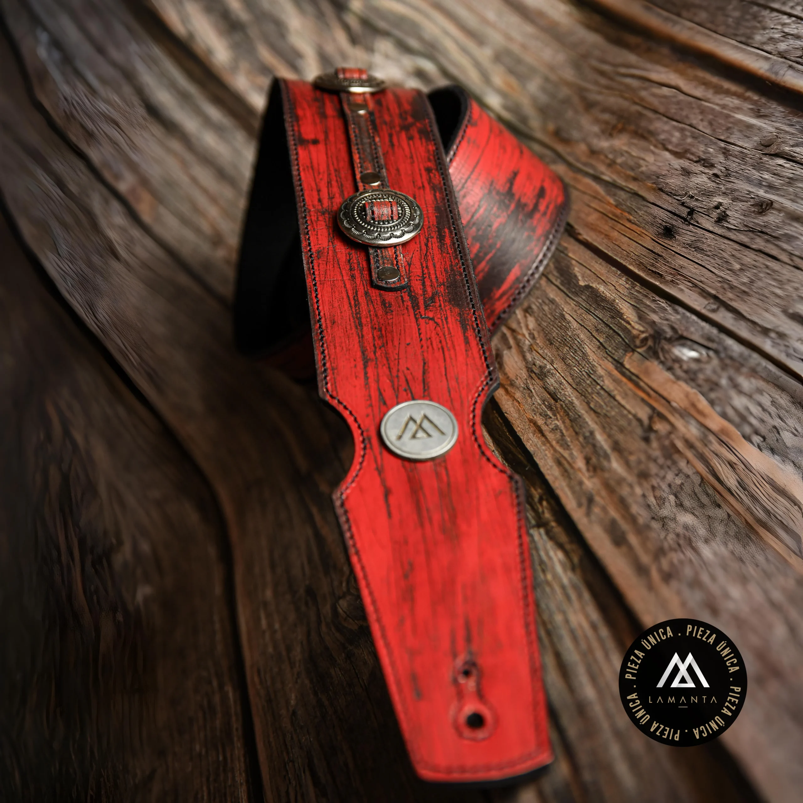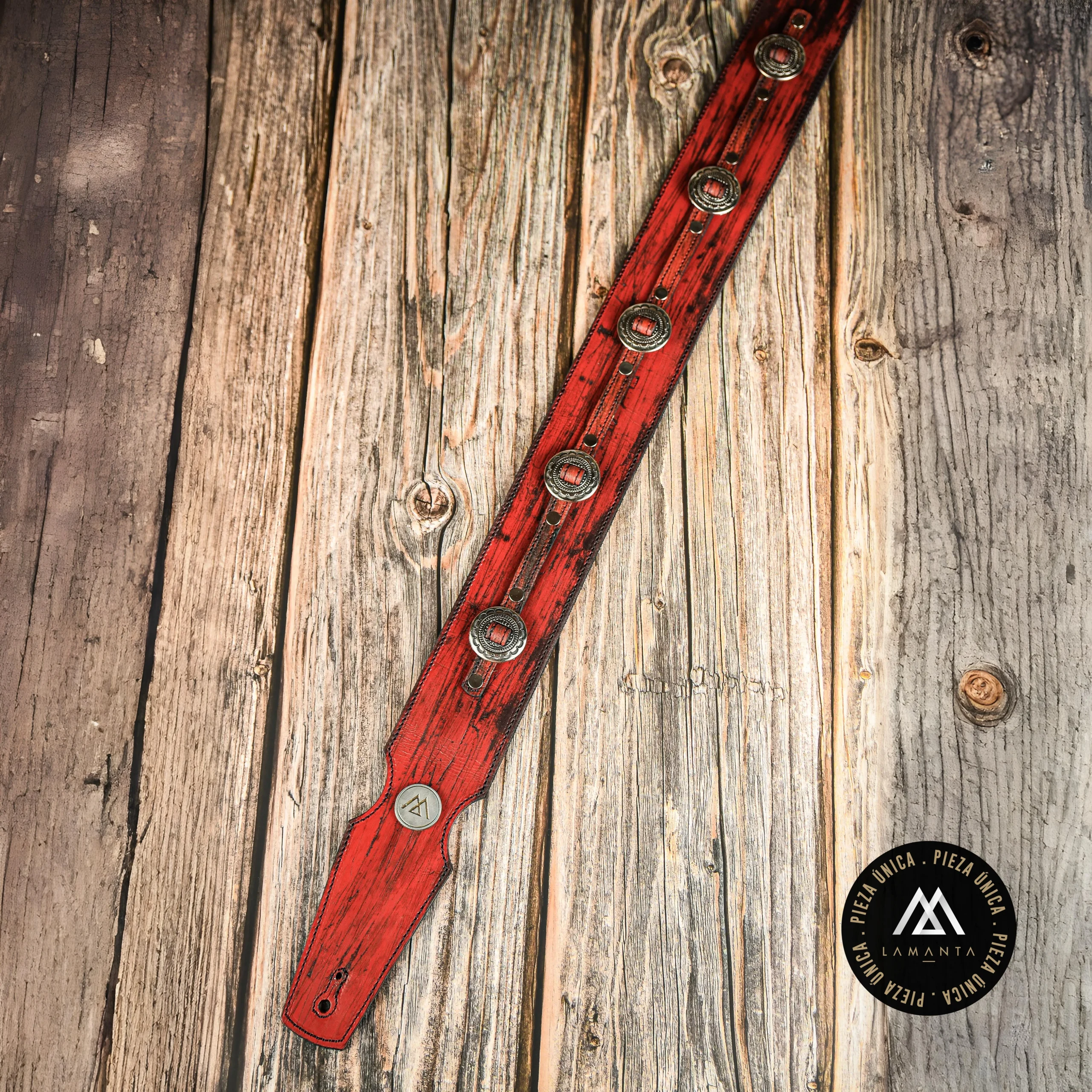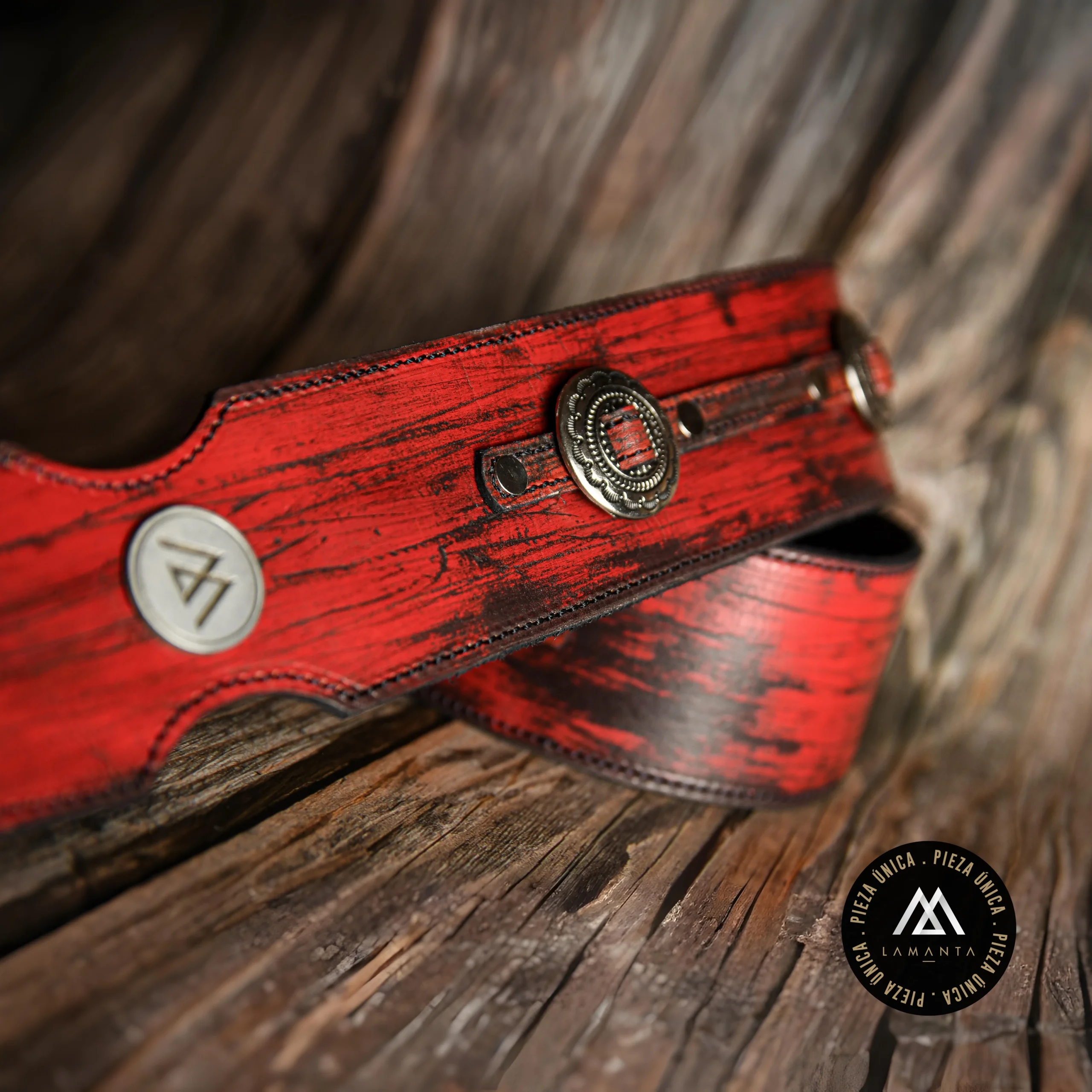 La Texas Classic Red Relic combina dos capas de cuero real con cinco medallones texanos bañados en plata. Su acabado rojo relic, logrado con pintura y lijado artesanal, le da una estética desgastada con mucho carácter.